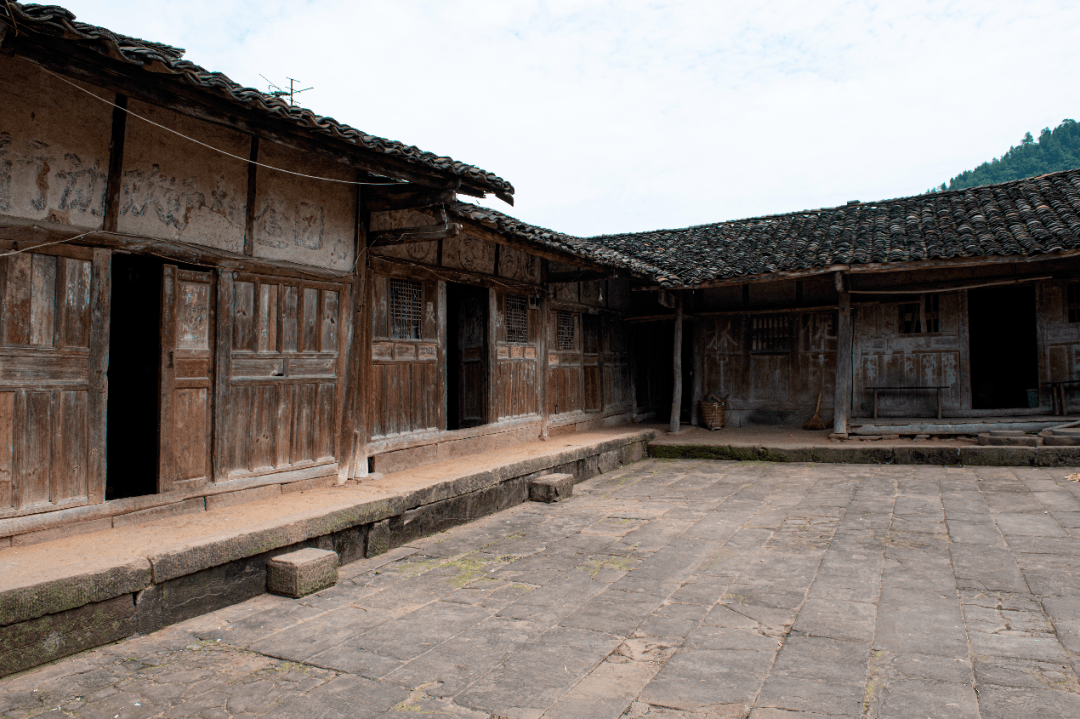 圆坝子古村落年代较为久远,保存较为完整,具有较高的保护价值。房屋紧靠农田耕地,与竹笼树林相依,是典型的多进院落式川东传统民居建筑群。从分布形态上,有一字式,即简易普通的一字型多开间民宅;有三合院,即常见的一正二厢,呈“门字形”;有四合院,即四方房屋围合空间,房屋檐口高度基本保持一致,全部以青瓦覆顶、木柱支撑、木板围壁,穿斗木结构。院坝则就地取材以青石板铺就,走在凹凸不平的石板上,仿佛听到了风云际会、时光唏嘘。