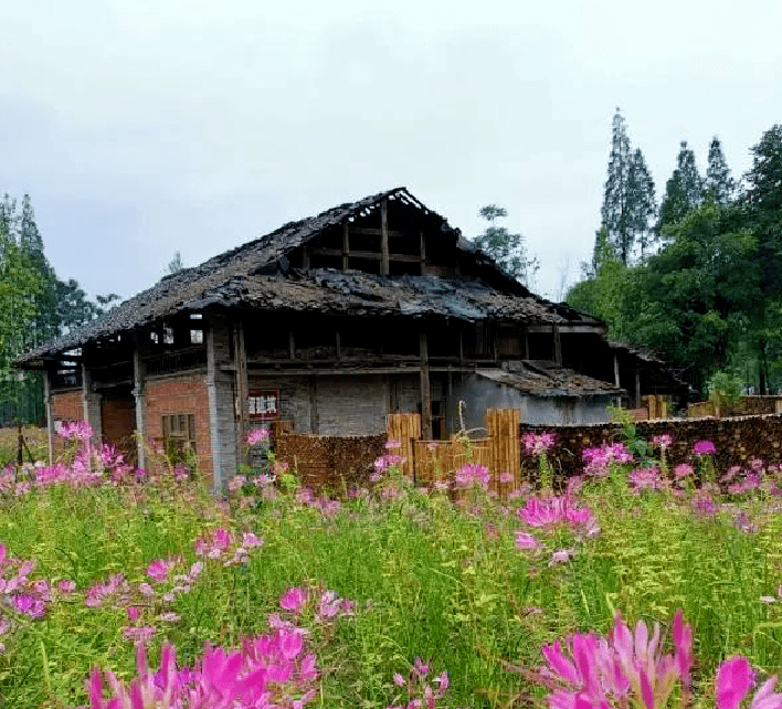 醉蝶花开满了江堤,几座砖砌的老房子孤零零的立在花丛里,挂着“保留建筑”的牌子,红底白字格外刺眼。房子面朝岷江,红砖青瓦竹围栏,那样的建筑,当年的主人应该是有些地位的。“不用思量古今,俯仰息人非。”如今,主人已不知去了何处?唯遗空房,柱斜瓦残,无门无窗。