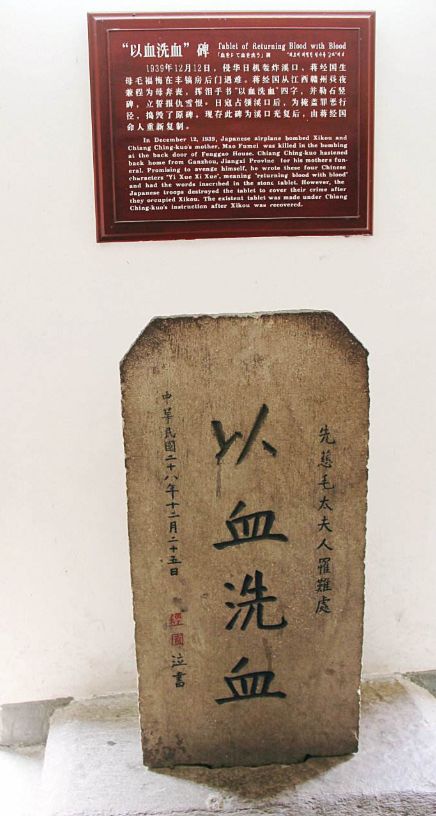1939 年秋天,日机轰炸奉化一带,娘被日本飞机炸死了。蒋经国得知消息,悲痛欲绝,立即赶回老家奔丧。他长跪在母亲灵前,眼泪长淌,恨得咬破了自己的嘴唇。在母亲遗体安葬的摩诃殿前,他饮泣写下“以血洗血”四个大字作为母亲的碑文。