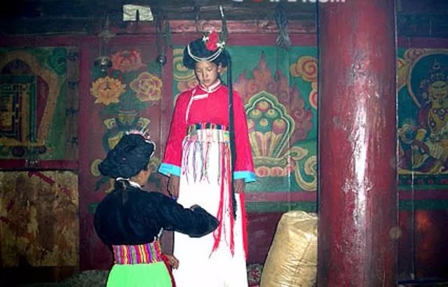 在人生礼俗方面,摩梭人一生最重要的仪式是成丁礼和葬礼,其中既有藏传佛教的影响,也有许多古老的包括来自母系社会的遗风。摩梭人认为未成年的男女还没有灵魂,不能参加社交活动,所以摩梭人的孩子到虚岁13时便要举行成丁礼,女孩叫“穿裙礼”(“图给”),男孩叫“穿裤子”(“细给”);成丁礼一律在大年初一早晨举行,地点在自己母亲家的母屋火塘下方的两棵柱子下,左柱为男柱,右柱为女柱,两柱必须取自同一棵在向阳坡上生长的古树所制,树的顶上一节作男柱,根部一节作女柱,象征女性是家屋的“根根”,男女同根同源,互补互助,平等和谐。