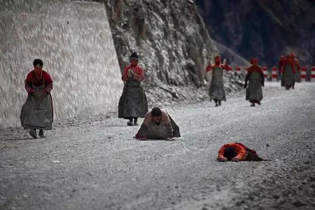 在川藏公路沿线,在那荒僻的山间小路上,常年行进着朝圣的人群。他们的人数有多有少,多的浩浩荡荡一行车队,少的一人踽踽而行;他们的交通工具有包车的,有搭便车的,有步行的;更有三三两两磕长头的在山谷间一步一步缓缓前行的——构成了一条奇异的风景线。