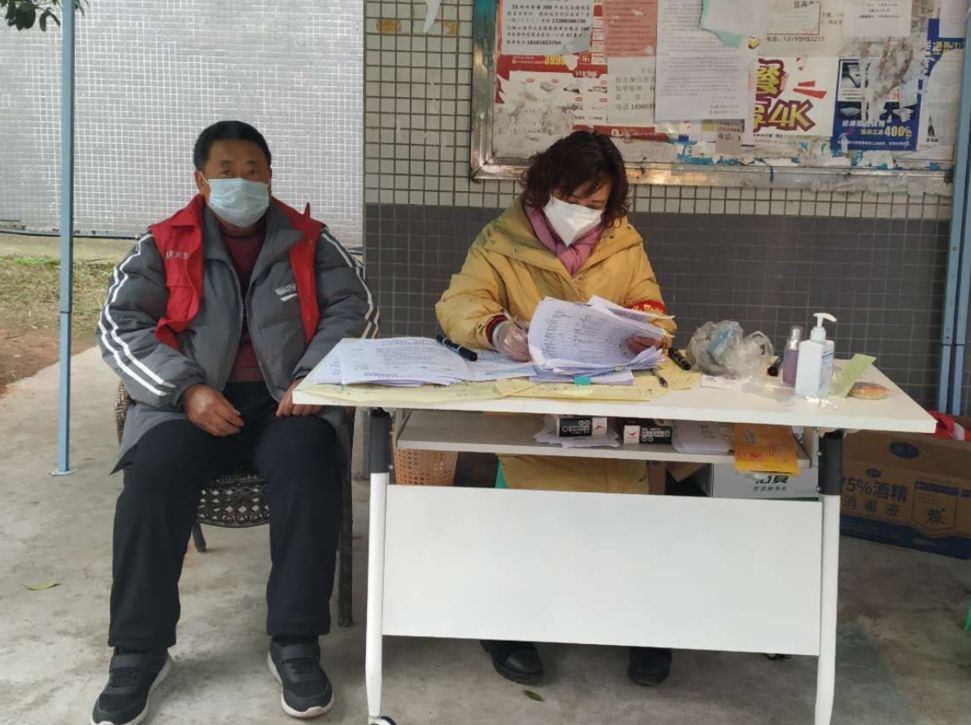 樊文娟老师和社区干部一起积极开展防疫宣传和排查工作