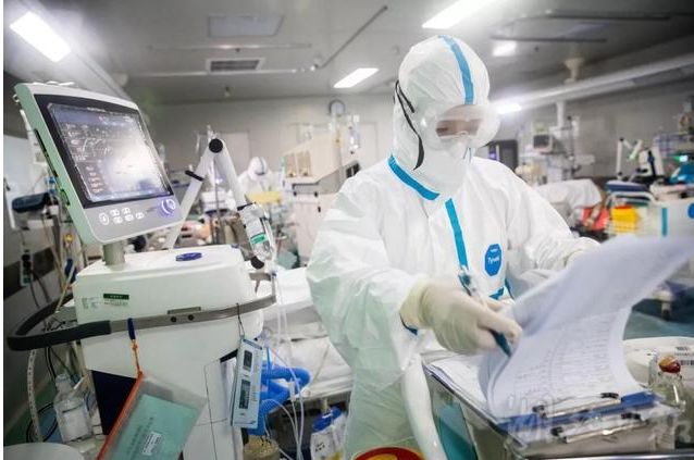 1月28日,武汉肺科医院,医护人员在ICU(重症监护病房)内检查重症患者的病例(柯皓 摄,图片来源:光明日报)