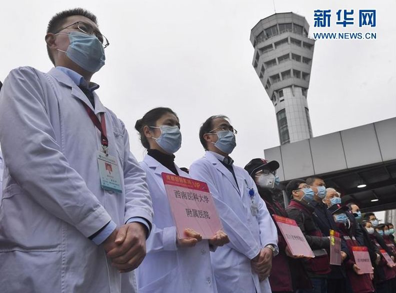 2月2日,在成都双流国际机场拍摄的四川第三批援鄂医疗队出发仪式现场(新华社记者 刘坤 摄)
