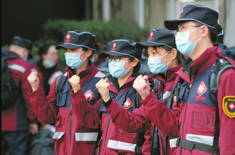 1月25日,四川省第一批援助湖北医疗队队员出征前在成都相互加油鼓劲,郝飞摄(图片来源:四川日报)