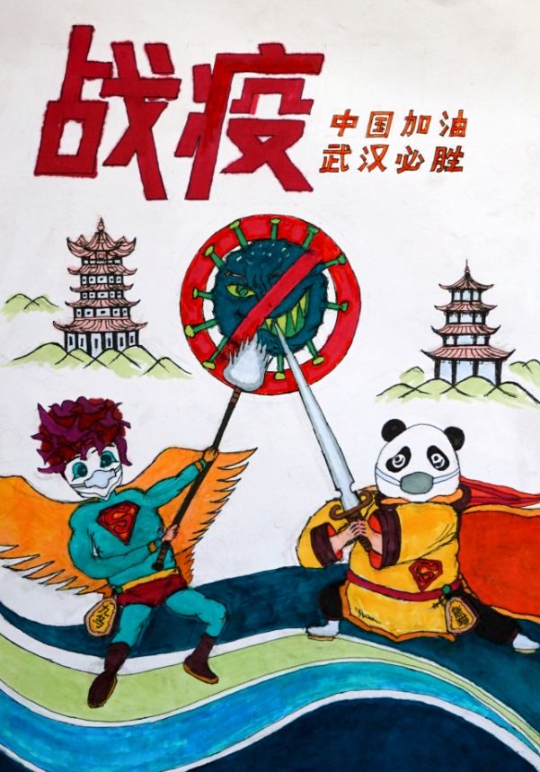 作品以抗击疫情为创作背景,选取湖北“九头鸟”以及四川“熊猫”为原型,用漫画手法修饰人物,体现共同抗击疫情的精神和中国必胜的决心。