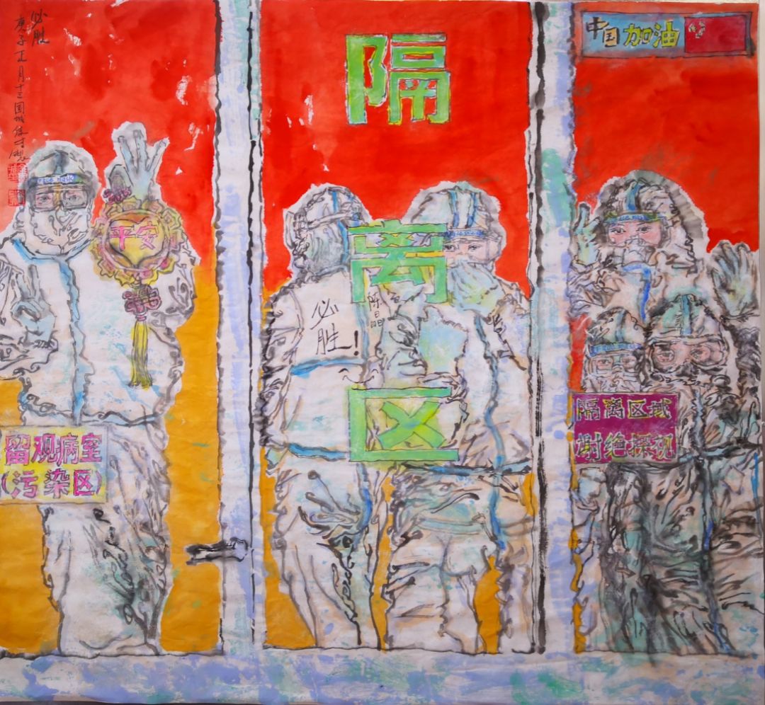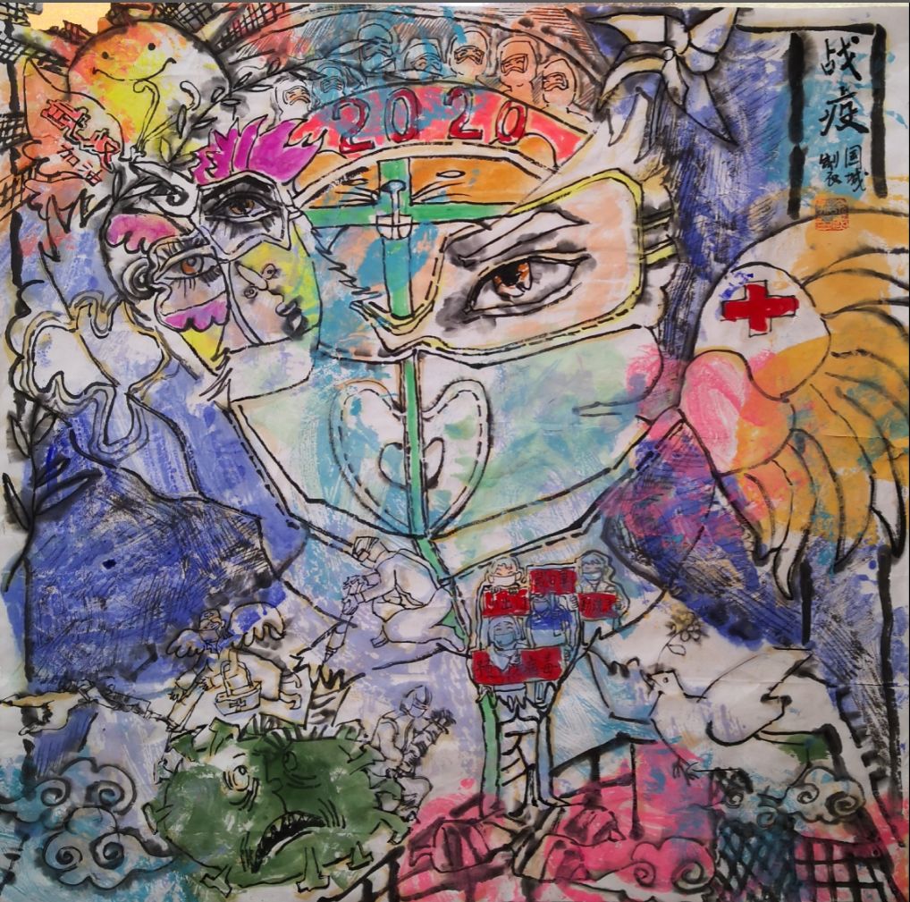 《战疫》:《大爱无疆》之后,心情久久不能平静。为什么我堂堂五千年华夏,竟遭此劫殇?心中一腔热血还在沸腾,我对祖国胜利的希望已冉冉升起!不为别的,只为祖国加油助威!我们要打响此次战役,与疫情奋战到底,戴口罩,紧眉头,戳病毒,日普照。种种意象瞬间涌上心头,此时不画何时画?提笔做《战疫》,为爱国英雄助威!这幅作品,用20世纪艺术立体主义流派画风,向毕加索的这种绘画风格致敬,并同时结合中国传统民间绘画艺术的元素,参考了油画、素描、拼贴画、版画以及中国传统年画的各个风格,将它们有机地结合在一起,相得益彰。