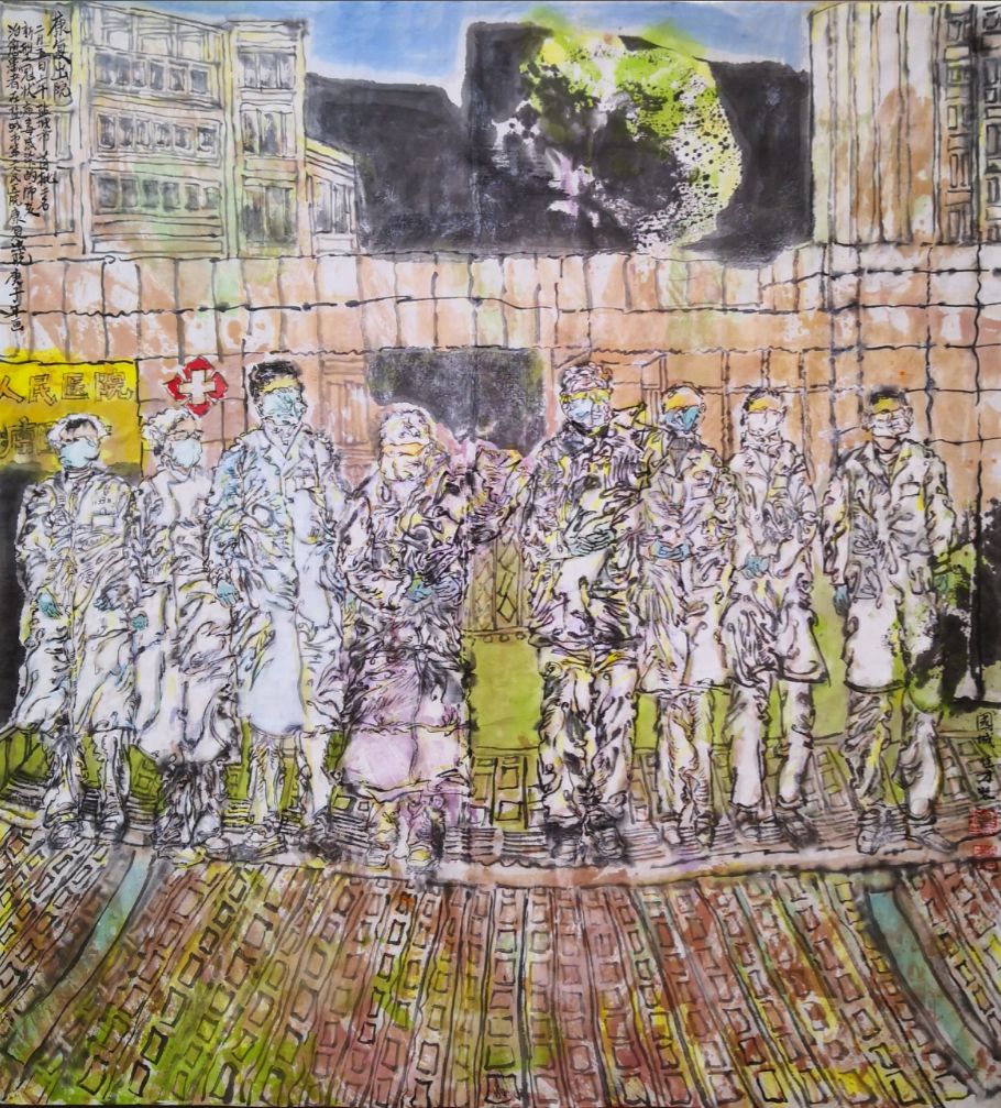 此一众医护人员都来自外省,而他们凭一腔爱国热血,毅然决然地走进了已经封城的武汉!我不禁由衷地赞叹“此为逆行者”,话音未落,画笔已提,挥毫泼墨,《致敬逆行者》已成!“祖国有我,武汉加油!”人民日报的话语更是掷地有声。
