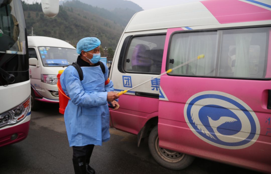 众志成城战新冠。图为工作人员正在对客运车辆进行消杀(2020年1月27日摄于广元市旺苍县客运站,唐福升 摄)