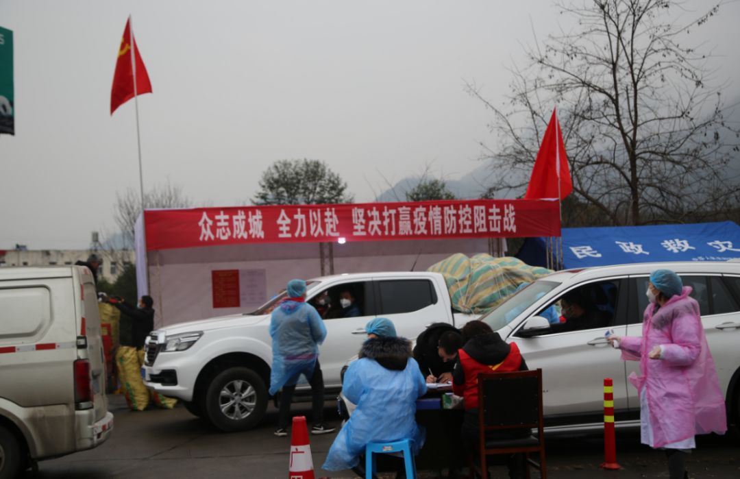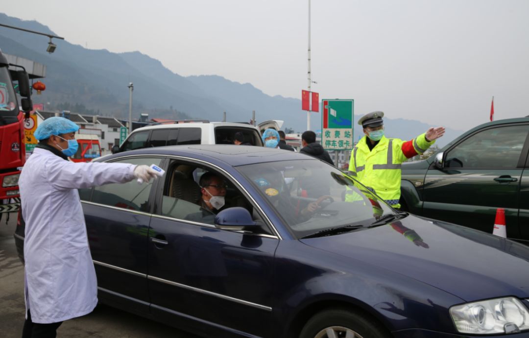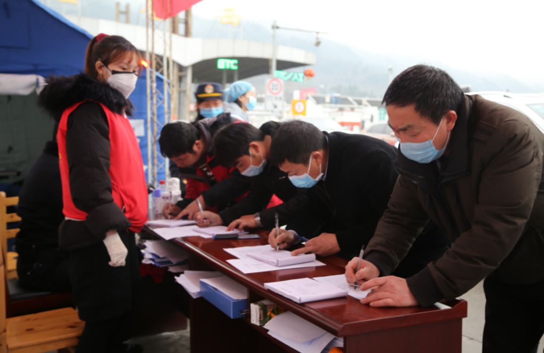 众志成城战新冠。图为志愿者和路政人员正在有序组织过往驾驶员登记车辆人员信息(2020年2月1日摄于旺苍县广巴高速旺苍西出口疫情防控监测点,唐福升 摄)