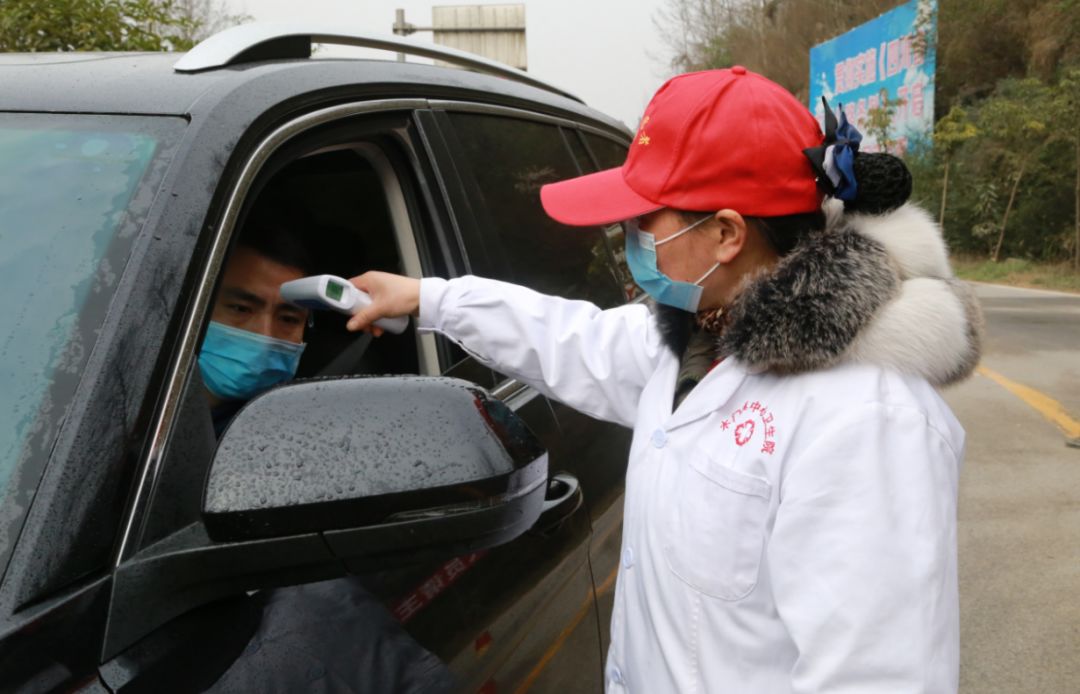 众志成城战新冠。图为医护人员人员正在测体温(2020年2月8日摄于旺苍县广巴高速木门出口监测点,唐福升 摄)