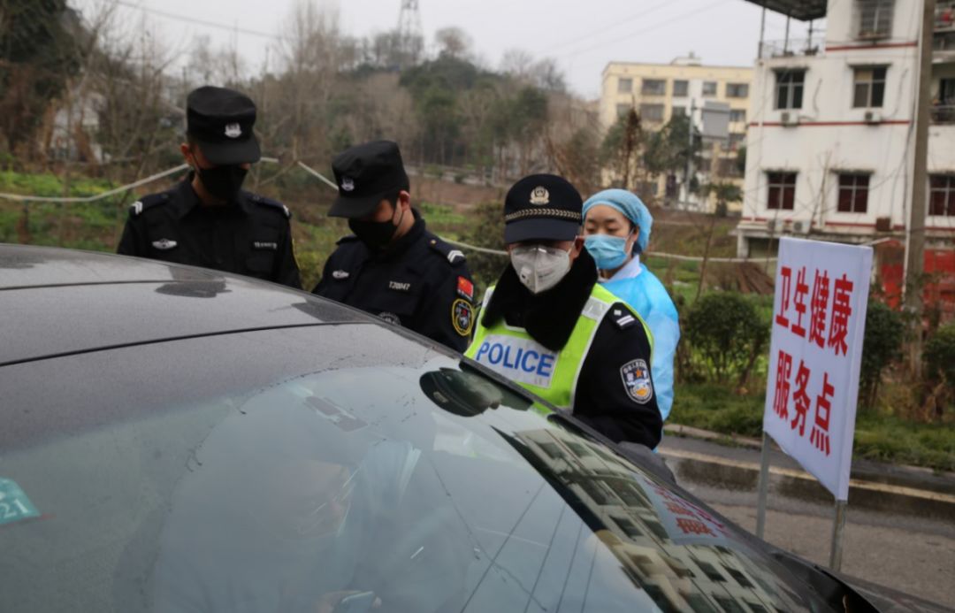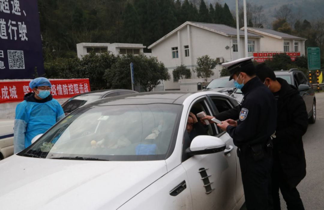 众志成城战新冠。图为公安民警正在逐车逐人核实信息(2020年2月8日摄于旺苍县普济镇疫情防控监测点,唐福升 摄)