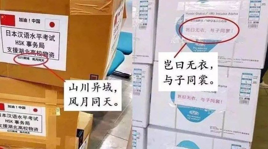 日本送来了援助物资,“山川异域,风月同天”“岂曰无衣,与子同裳”的诗句让我们更加珍惜两国情谊。明月何曾是两乡,感谢所有援助我们的外国朋友,中国人民会更加珍惜这份友谊。