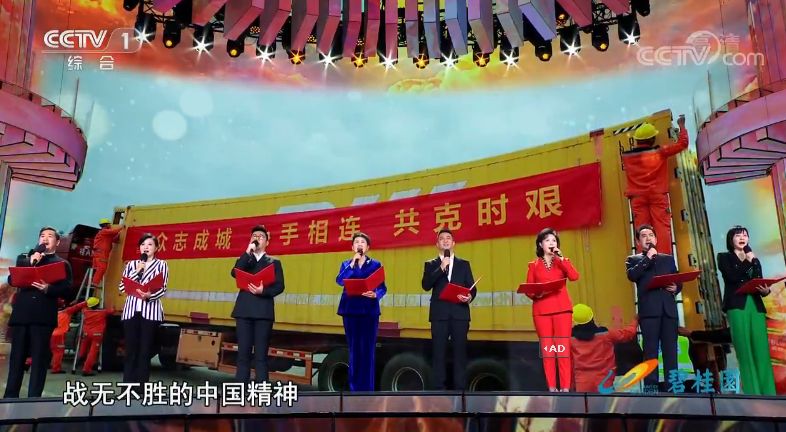 诗朗诵《中国阻击战》,将这台晚会推向了最高潮。字字铿锵有力,“一方有难、八方支援的中国特色,让我们无往不胜,为患者点燃生的希望,为弱者撑起爱的晴空……”。背景画面定格在全国各地驰援武汉的照片,从医务工作者义无反顾冲锋在前,到防控物资相关生产企业及时复工、全力保供;从人民解放军闻令而动、积极支援地方疫情防控,到科研人员争分夺秒、强化攻关;从基层群防群治构筑严密防线,到交通运输、电力保障、市场供应等行业职工履职尽责、携手共筑坚强后盾,再到社会各方纷纷捐款捐物……中华儿女心往一处想、劲往一处使,形成抗击疫情的强大力量。