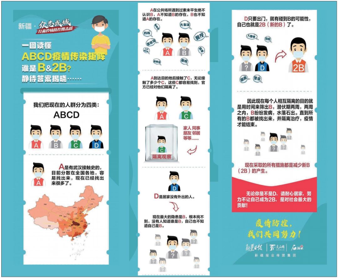 有人把大疫之下的人们分为ABCD四类:A是有武汉接触史的人(包括健康者、感染者和无症状感染者);B是A在公共场所遇到过的“路人”;C是与A接触过的亲友;D是居家一直没有外出的人。普遍认为B是最大的隐患,因为没有人知道谁是B,可能B自己都不知道自己已经是B,而与B接触过的人变成2B(新的B)。其实,对普通老百姓而言,单就怎么认定A(是否是需要“防备”的人)、怎么对待A就是一件很头疼、很揪心的事了;谁能说自己是纯粹的D——有B和2B的存在,或许自己早已是2B了……病毒奸猾,防不胜防,难怪有人称之为“流氓病毒”。