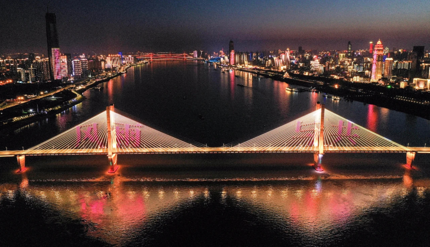 3月18日晚,武汉长江二桥上打出“风雨与共”的字样(新华社记者 陈晔华 摄)