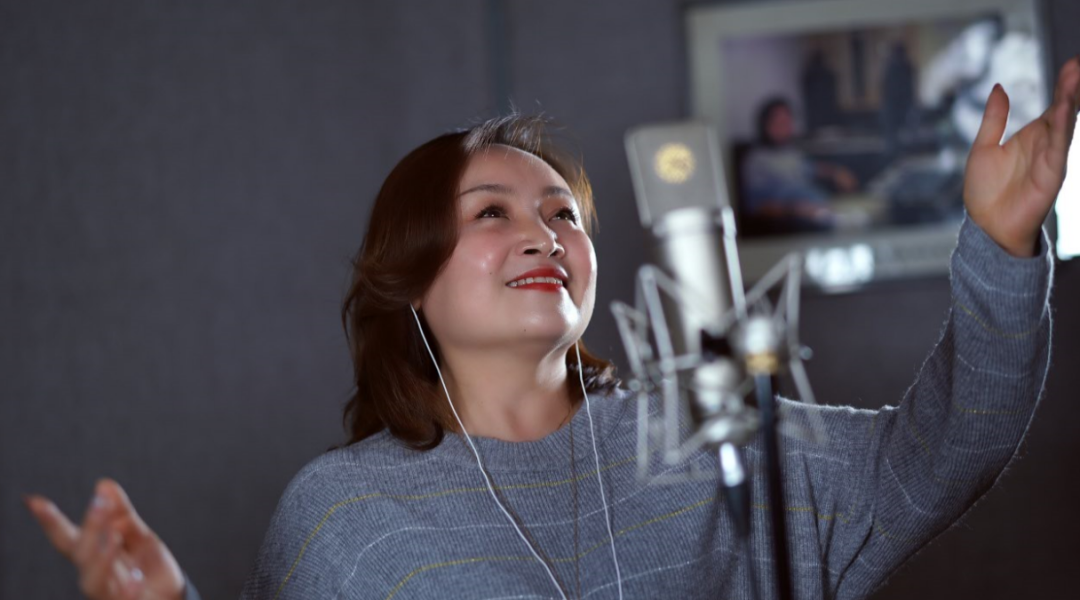 张文静在录音棚录制战“疫”歌曲《最美的风景》