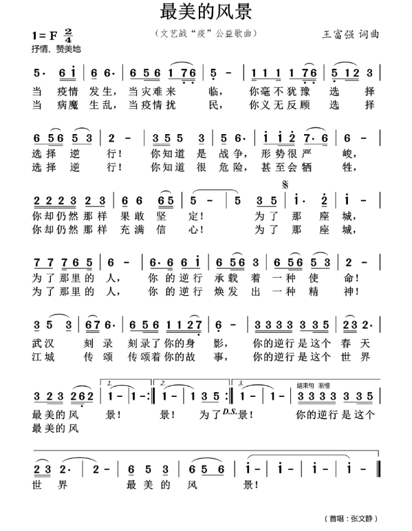 张文静说:“一个偶然的机会,我在微信群里欣赏到了一首旋律优美情感真挚的歌曲《恰好》(瞿琮词,王富强曲,刘桐唱),这首歌的词曲深深地吸引了我,触动了我的心灵,我情不自禁地为这首歌点赞!‘恰好你来,恰好我在,恰好那一天春暖花开……’当时一听到这首歌,就好期望有机会能认识王富强老师并敬请她为我量身创作一首歌!《恰好》就这样让我与著名歌曲作家王富强老师结缘了!当我阅览到王富强老师作词并作曲的这首战‘疫’主题的公益歌曲《最美的风景》词曲时,一下就被作品深刻的主题、意象的塑造、平实的表达吸引住了。一哼,旋律优美,朗朗上口,非常打动人心。短短几遍学唱后,歌词、旋律便牢牢地印在了我的心里。‘为了那座城,为了那里的人,你的逆行承载着一种使命,你的逆行是这个世界最美的风景……’作品歌颂了全国人民团结一心抗击疫情的家国情怀。我内心被逆行者们平凡而伟大的无私、勇敢的奉献精神震撼了!作为一名文艺战士,特殊时期的责任和使命,我决心认真演绎好这首意义非同一般的战‘疫’作品,将这首传递温暖、传播大爱的作品献给战斗在抗疫第一线的工作人员,为武汉加油!为祖国加油!”