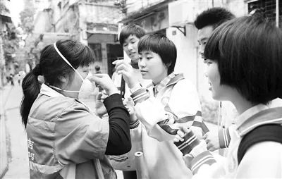 志愿者们为环卫工人戴上口罩(图片来自网络)