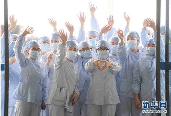 3月23日,武汉市第一医院一些医护人员在武汉天河机场为广东第14批援鄂医疗队送行。广东第14批援鄂医疗队在武汉期间,整建制接管武汉市第一医院4个重症病区,与医院的本地医护人员结下深厚的友谊(新华社记者 陈晔华 摄)