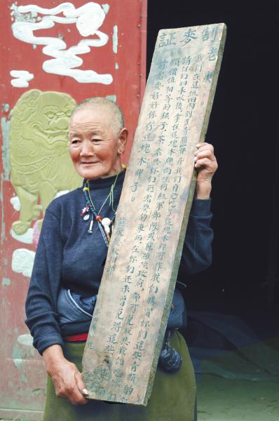 松潘县毛儿盖镇克藏村的仁青卓玛与家中留传下来的红军割麦证合影。松潘县委宣传部供图