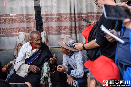 松潘县毛尔盖镇96岁的藏族老人罗让向记者讲述他当年见过红军长征途经松潘的故事。