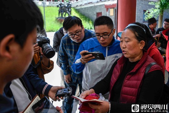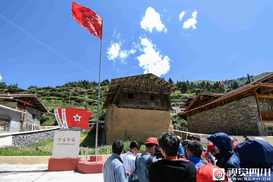 记者们在松潘县毛尔盖镇沙窝会议遗址处采访。