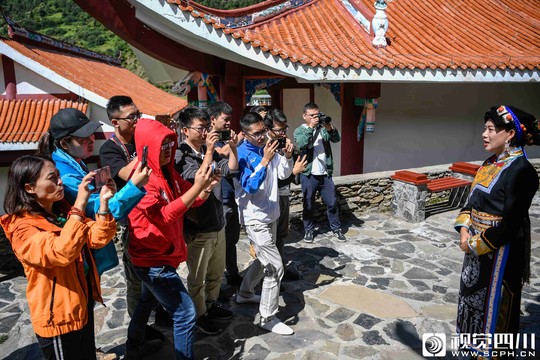 马尔康市卓克基土司官寨讲解员向记者们讲述红军召开卓克基会议的故事。