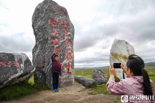 一位少先队员在红军长征途经的日干乔大沼泽前拍照留念。