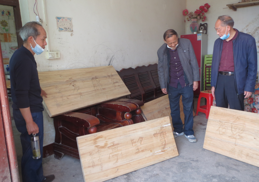 在碑刻工匠阮氏家里查看纪念设施所用碑刻挂匾