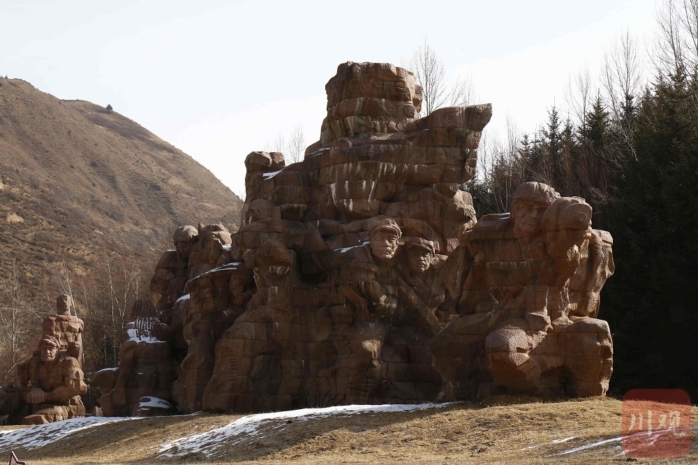 松潘县川主寺镇元宝山上青松挺拔,翠柏成荫,白雪覆阶。2月1日,在红军长征纪念碑碑园工作人员引导下,记者呼吸着松柏特有的清香,顶着高原烈日的曝晒,经过20多分钟费力攀登,高高耸立在元宝山顶的红军长征纪念碑,近在眼前。长长的基座上,一名红军战士一手举枪,一手握花,双手高举成“V”字形,指向苍穹,黑色伟岸身躯与蓝白色天空形成鲜明对比。