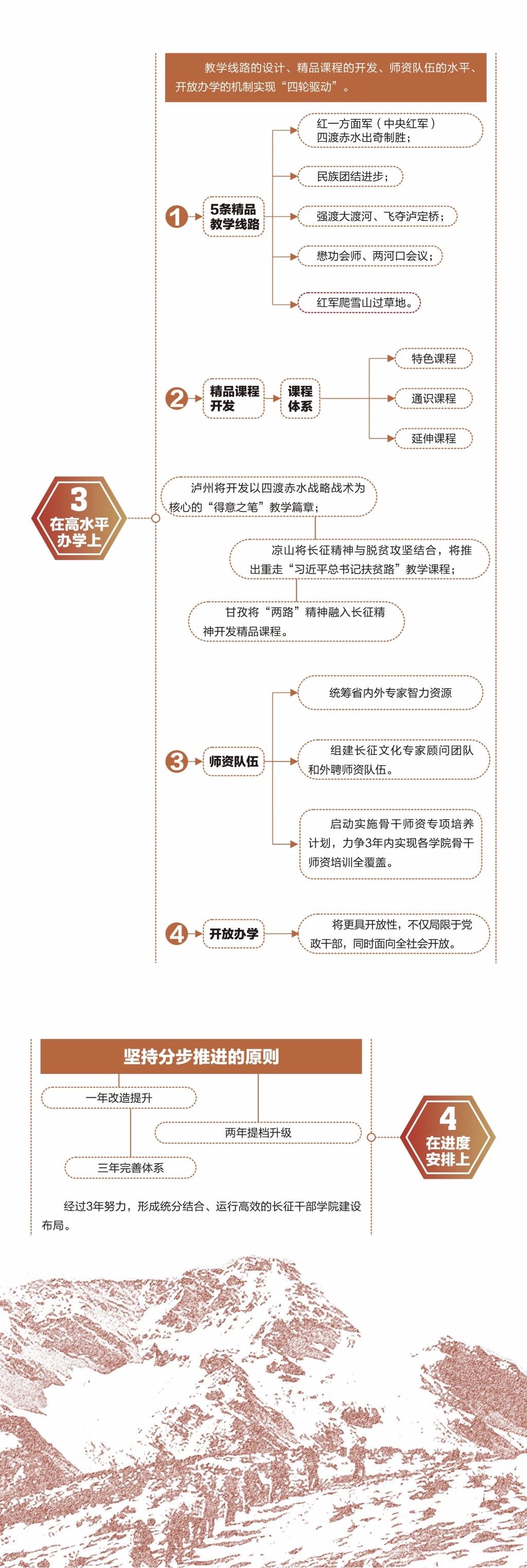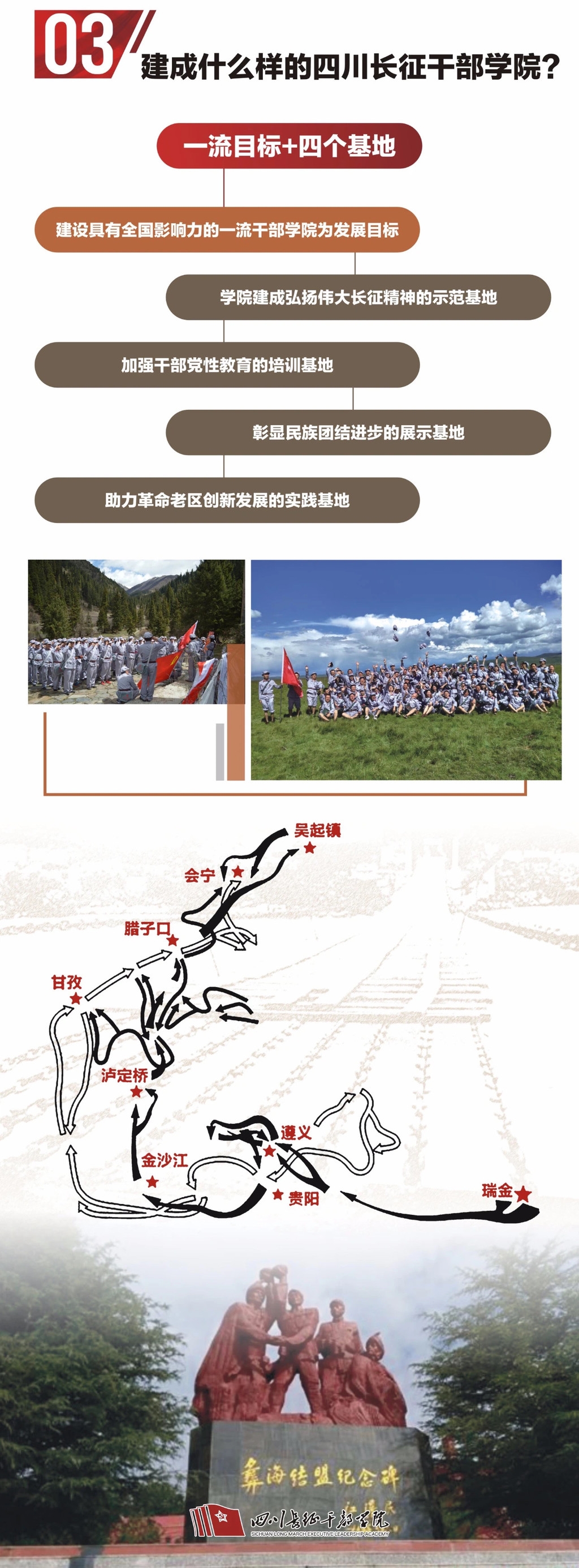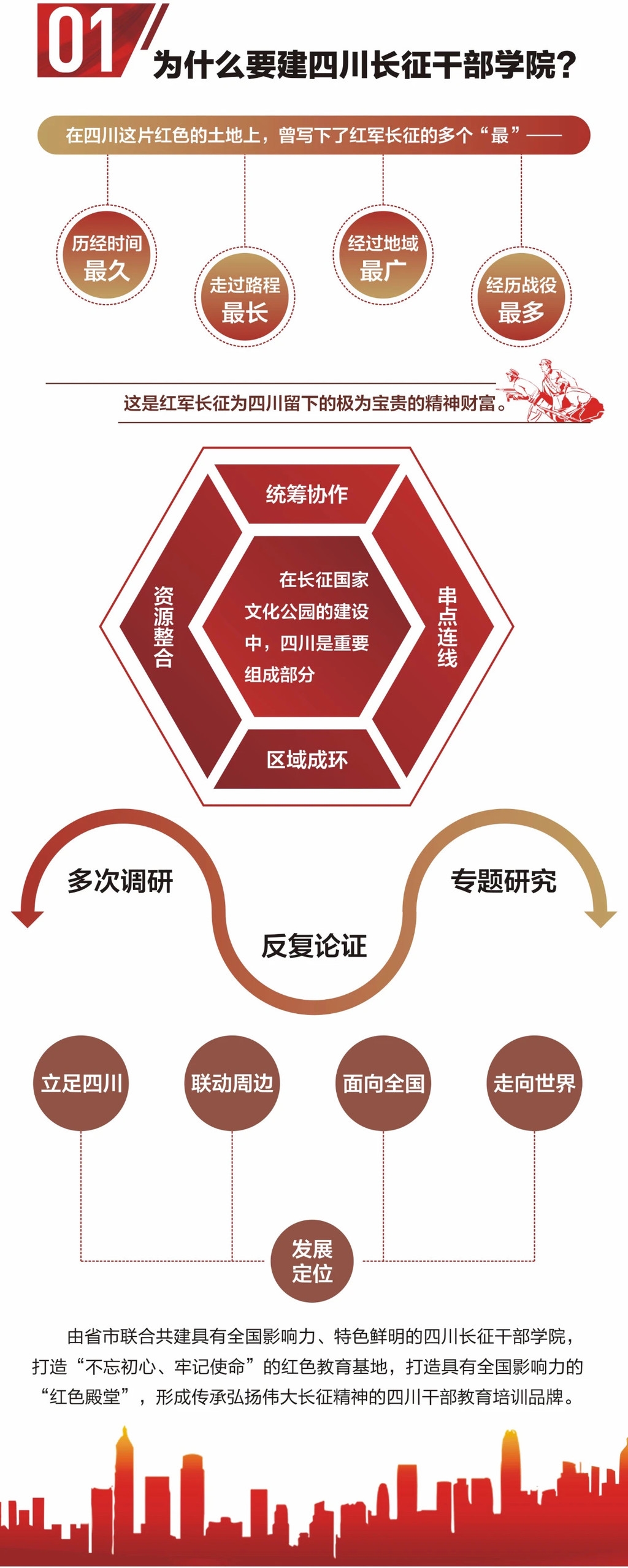 四川是红军长征历经时间最久、走过路程最长、经过地域最广、经历战役最多的省份,红军长征为四川留下了极为宝贵的精神财富。为深入挖掘盘活这一丰富的红色资源,四川正通过省市联合共建具有全国影响力、特色鲜明的四川长征干部学院,形成传承弘扬伟大长征精神的四川干部教育培训品牌。