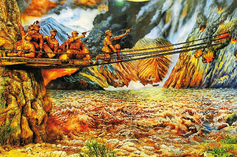 在超出常人想象的毅力支撑下,红四团战士在艰险的悬崖峭壁间小道上长途奔袭,终于在规定时间里抵达泸定桥西桥头。
