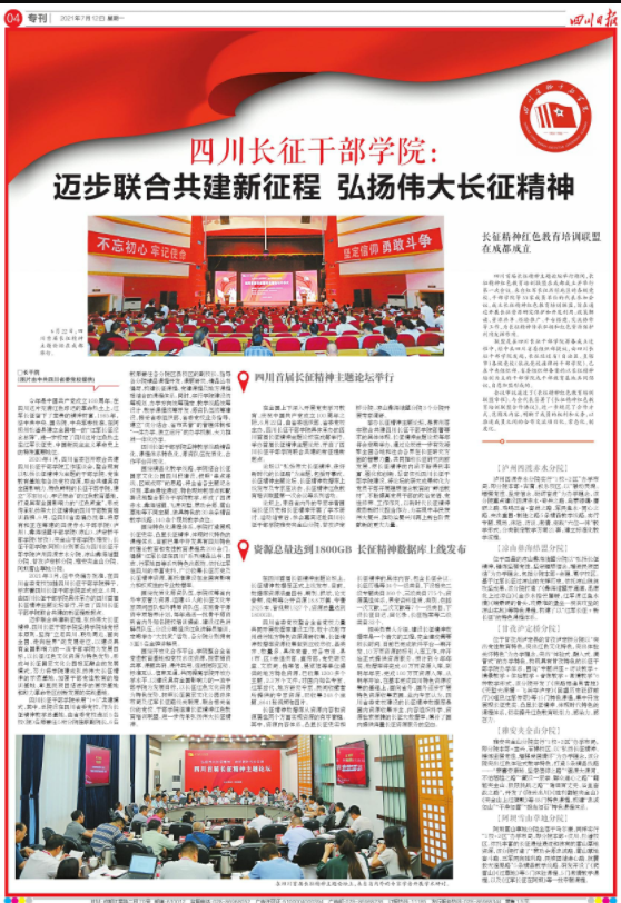 2021年3月,经中央编办批准,在四川省委党校加挂四川长征干部学院牌子,标志着四川长征干部学院正式成立。6月,由四川长征干部学院具体承办的四川首届长征精神主题论坛举行,开启了四川长征干部学院联合共建的新征程新起点。