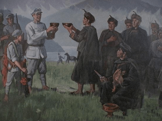 红军乘胜打通飞越关,北上取道荥经;班长舍命三交水子地,润之安然无恙。炳辉善运筹,奇袭夺取天全,巧扮老百姓,占领芦山周村岗。抢修栈道,宝兴硗碛藏族拉起“天花”;战胜天险,喇嘛吹起莽号迎送吉祥。风烈烈,马啸啸,单衣难御高原寒;雨蒙蒙,雪皑皑,草鞋怎抵泥沼凉;志坚坚,信旦旦,摸爬滚打翻雪山;军威威,魂汤汤,征服夹金奠绝唱。不忘初心,主席让马伤员,情义无价;北上图强,恩来激励将士,言词铿锵。难以梳理,当年铁血男儿的原始情怀;无法丈量,贴近雪山草地的磅礴理想。