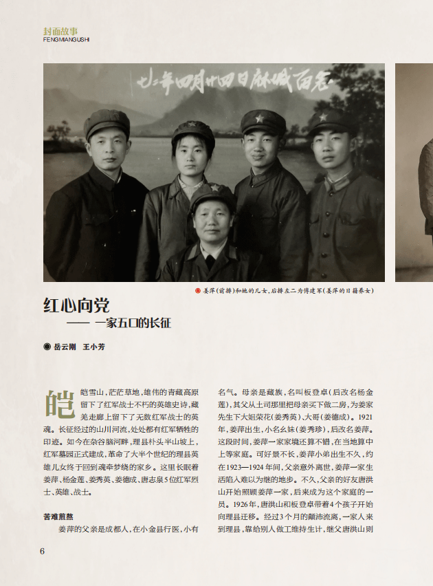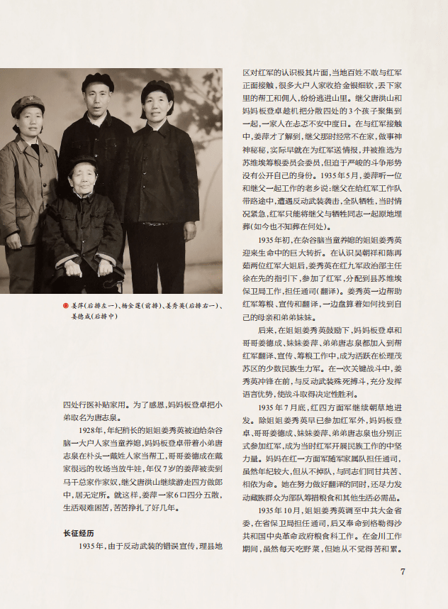 1935年7月底,红四方面军继续朝草地进发。除姐姐姜秀英早已参加红军外,妈妈板登卓、哥哥姜德成、妹妹姜萍、弟弟唐志泉也分别正式参加红军,成为当时红军开展民族工作的中坚力量。妈妈在红一方面军随军家属队担任通司,虽然年纪较大,但从不掉队,与同志们同甘共苦、相依为命。她在努力做好翻译的同时,还尽力发动藏族群众为部队筹措粮食和其他生活必需品。
