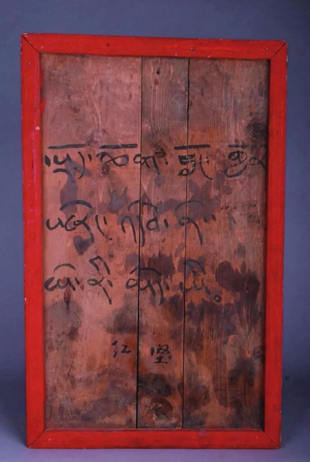 标语一为藏文木板标语。木板为长方形,长76.5厘米,宽48厘米。标语文字以藏文墨书,从左至右横书三行,字径7厘米,汉文大意是:“红军是保护你们的,大家要安居乐业,好好种庄稼。”落款为汉文行书“红坚”二字。