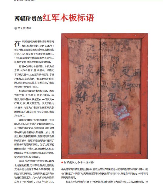 在四川省阿坝州博物馆珍藏着两幅红军木板标语,这是1935年7至8月红军长征途经松潘毛尔盖期间书写的,1971年征集于松潘毛尔盖地区,1995年被国家文物鉴定委员会定为一级革命文物,并多次参加各级文物展。