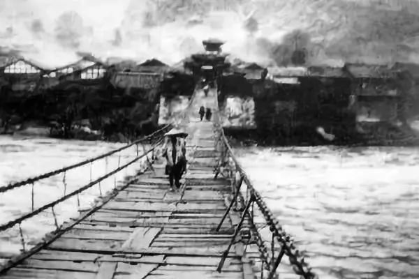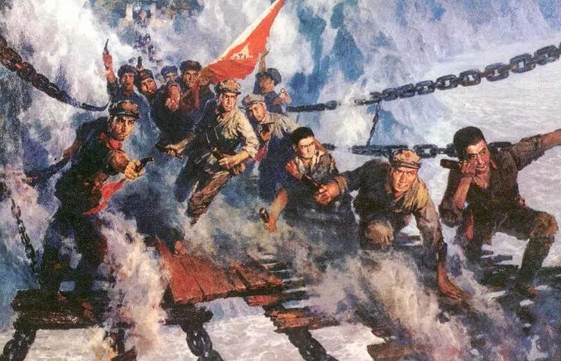这些川军常年都是收税的,谁打过仗啊。结果吓得是点了门楼子就往后山逃跑,往泸定镇后边的森林逃跑,这时候红军开始一边铺板子一边开始爬桥,走到中间,火已经着起来了,结果突击队队长就犹豫了,回头望,看首长怎么说,团长政委高喊,同志们呐,犹豫不得呀,冲过去呀,结果红军就往上冲,冲了以后,脱下衣服来拿衣服扑火,终于把泸定桥给夺下来了。所以这是真实的飞夺泸定桥。