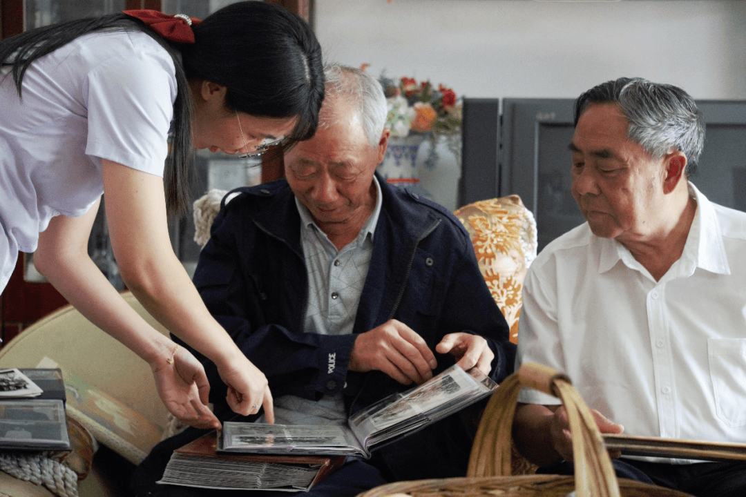 王玉高老人向实践成员展示学校开展活动的老照片(刘家韵 摄)