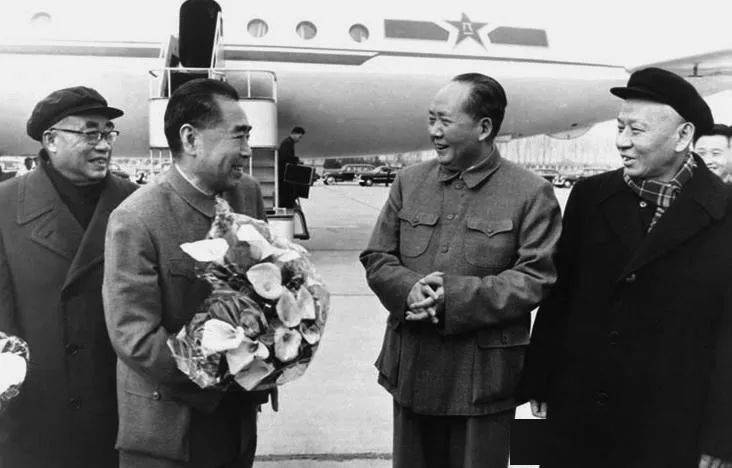 1964 年11 月,毛泽东(左三)、刘少奇(右一)、朱德(左一)到机场迎接从莫斯科归来的周恩来(左二)