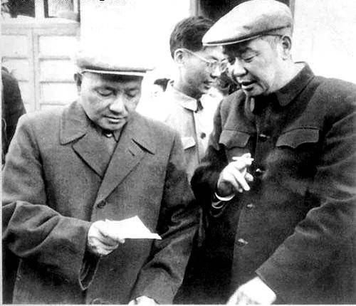 1965年11月底,邓小平视察西南三线建设,图为邓小平(左二)、程子华(右二)、吕正操(右一)在冶金指挥部楼前交谈。