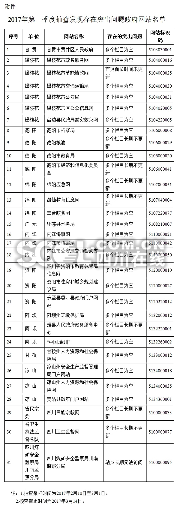 四川2017年一季度政府网站抽查 发现两个问题(附名单)