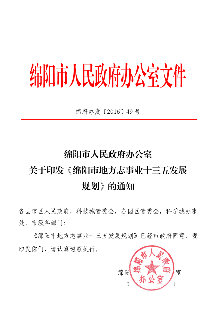 绵阳市人民政府办公室关于印发《绵阳市地方志事业第十三五发展规划》的通知 绵府办发〔2016〕49号 来源:绵阳市人民政府办公室 发布时间:2019-12-03 10:45:05 浏览次数: 次 【字体:小 大】 扫一扫在手机打开当前页 分享到: 【打印正文】