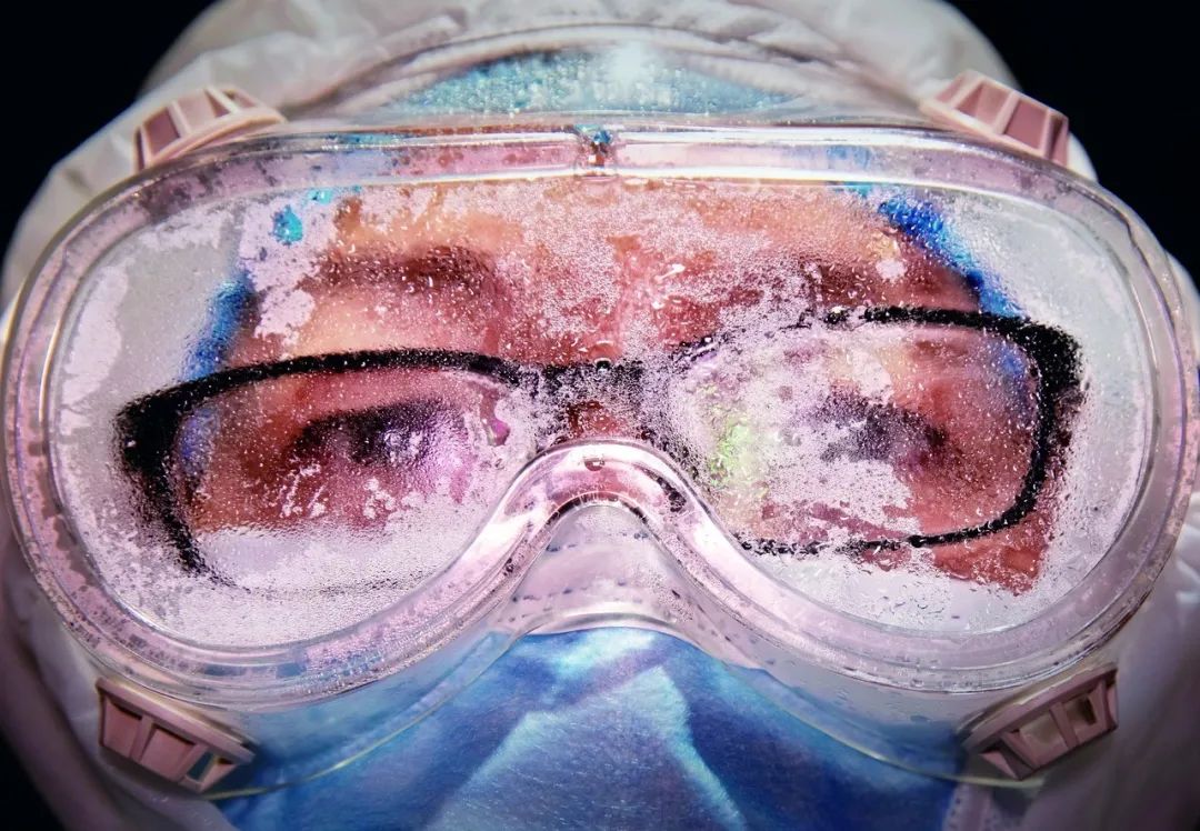 2020年3月4日,四川省西昌市医务人员长时间工作,护目积满是雾水(邹森 摄)