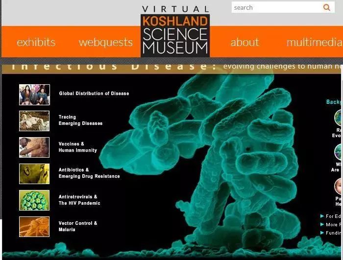 五是玛丽安·科什兰在线科学博物馆。该博物馆是线上展览,博物馆内容包括全球疾病分布、新兴疾病追踪、疫苗和人类免疫、疾病传播背景、公共健康安全、抗生素及新出现的耐药性等板块,可以进行线上学习和浏览。